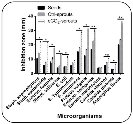 The antimicrobial activity of control seeds, control (ambient CO2-exposed) sprouts, and elevated CO2 (eCO2)-treated sprouts of Trachyspermum ammi. Data are represented by means ± standard deviations of at least 4 replicates. Bars with (**) symbols within each microorganism indicate significant differences among the three sample types at p < 0.05. Bars with (*) symbols within each microorganism indicate significant differences among control and treated sprouts at p < 0.05.