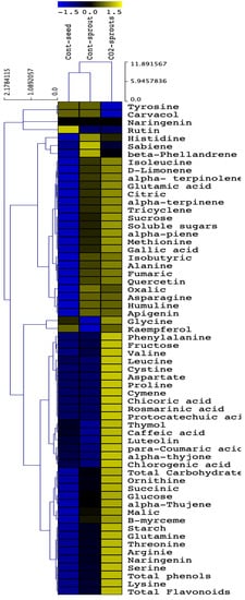 Hierarchical analysis of primary and secondary metabolites in control seeds, control (ambient CO2-exposed) sprouts, and elevated CO2 (eCO2)-treated sprouts of Trachyspermum ammi. Faint olive and blue colors represent high and low values, respectively.