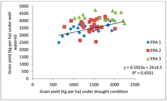 Grain yield of hybrids (period 1 to 3) under drought was regressed on the yields under rainfed conditions. The analysis revealed high grain-yielding ability for the period 3 hybrids compared to those of periods 1 and 2. This elucidated the magnitude of progress made in the period 3 hybrids as far as high yield was concerned. From the regression analysis, it was easy to identify the superior period 3 hybrids under drought, rainfed, and across environments compared to those of period 1 and 2. These results, therefore, justified the efforts and resources expended by the IITA-MIP to increase the genetic gains from selection among the extra-early maturing maize in SSA [29,30].