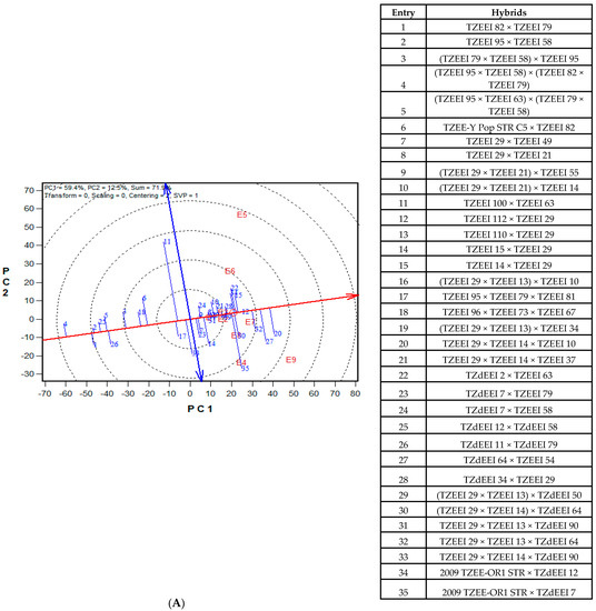 The best performing hybrids under moisture-limited environments were identified with the aid of the multiple trait base index (MI) involving high GY with good agronomic characters [9]. Using the MI, 35 hybrids (top 20 drought tolerant, mid five, and 10 most drought susceptible) were used in a GGE biplot analysis which investigated the main effects of genotypes and also its interaction with the environment [38] to identify hybrids that yielded high with better stability across the environments where they were tested.