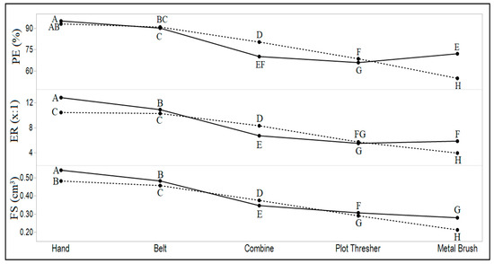 Least square means of popping efficacy (PE), expansion ratio (ER) and flake Size (FS) for the different combinations of threshing method and harvest moistures. The dashed line represents the low moisture harvest, and the solid line represents the high moisture harvest. Connecting letters going across for a given popping trait are not statistically different at α = 0.05 using L.S.D.