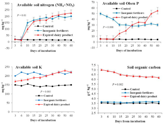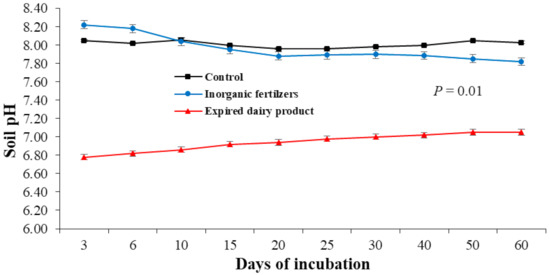 The added organic fertilizer had clear effects on improving the organic carbon in the sandy soil (Figure 2). Moreover, the extracted organic fertilizer had a clear effect in the soil pH (Figure 3). The soil pH reduced significantly when the soil was amended with the extracted organic fertilizer compared to the untreated soil and the inorganic fertilization. The extracted organic fertilizer significantly minimized the soil pH from to 7.05 in the end of the incubation experiment. The highest pH values were recorded in the control and inorganic fertilization treatments. Addition of the investigated organic fertilizer enhanced the soil organic-C from 3.6 to 7.0 g kg−1 (Figure 2).