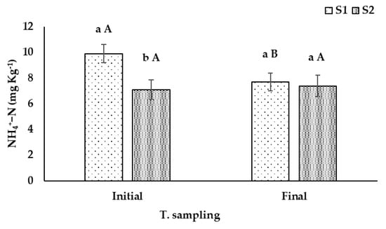 | NH4+-N | Initial | 6.24 ± 0.45 b | 7.67 ± 0.5 a | * | 6.91 ± 0.56 a | 5.43 ± 0.47 b | * |