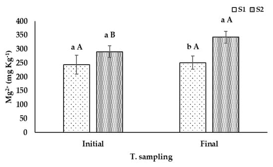 | Mg | Initial | 43.29 ± 4.15 b | 244.02 ± 19.53 a | * | 68.13 ± 8.49 b | 290.64 ± 18.33 a | * |