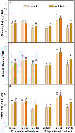 Content of chloroplast pigments was subjected to almost similar changes under the salinity stress, as well as potassium supplementation (Figure 3A–C). In a shorter period of saline treatment (10 days after salt treatment), the higher salt dosage had a degrading effect on chlorophyll a (Figure 3A) and carotenoids (Figure 3C). This negative effect was mitigated by the increase of potassium level in soil. Salt stress did not change the level of chlorophyll b in the first term. In the second date of stress, the level of all pigments increased in grasses treated with the lower dosage but did not change at the higher salt dosage. Enriched potassium level resulted in a significant increase of chlorophyll a and b in plants grown at the higher dosage of halite.