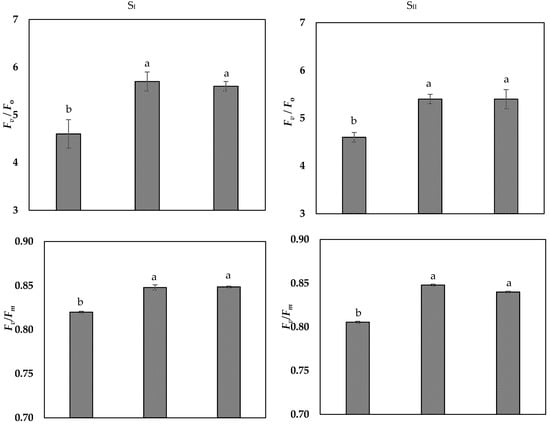 Effects of selenium (Se; mg L−1) foliar applications on Chlorophyll a fluorescence i.e., (Fv/Fm and Fv/F0) and photosynthetic performance index (PI) of onion under saline soil (EC = 5.2 dS m−1) conditions in SI and SII seasons. Vertical bars represent means ± S.E (p ≤ 0.05). Columns marked by different letters are significantly different.