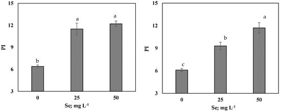 Onion growth characteristics and biomass results are presented in Table 3. Se-treated onions with 25 mg L−1 or 50 mg L−1 showed enhanced growth (e.g., shoot length, number of leaves, and leaf area) and biomass (shoot fresh and dry weight) compared to the non-treated plants. These improvements were more pronounced at 50 mg L−1 Se, which caused an increase of shoot length by 20% and 39%, the number of leaves by 45% and 30%, leaf area by 134% and 184%, shoot fresh weight by 165% and 134%, and shoot dry weight by 183% and 131% in SI and SII, respectively, compared to the control.