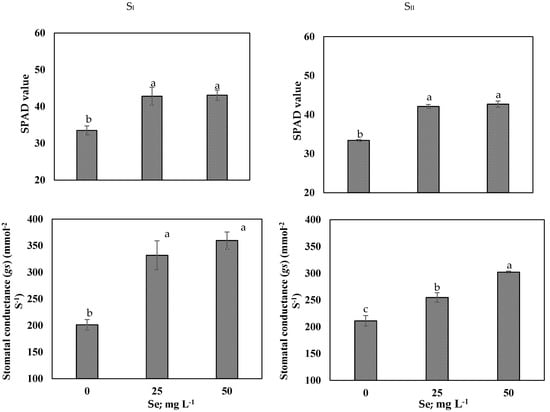Effects of selenium (Se; mg L−1) foliar applications on SPAD value and stomatal conductance (gs) of onion under saline soil (EC = 5.2 dS m−1) conditions in SI and SII seasons. Vertical bars represent means ± S.E (p ≤ 0.05). Columns marked by different letters are significantly different.