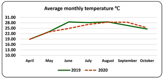 Average monthly temperature (°C) of the experimental site during summers 2019 and 2020.