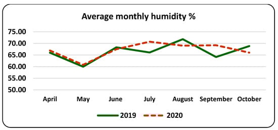 Average monthly humidity (%) of the experimental site during summers 2019 and 2020.