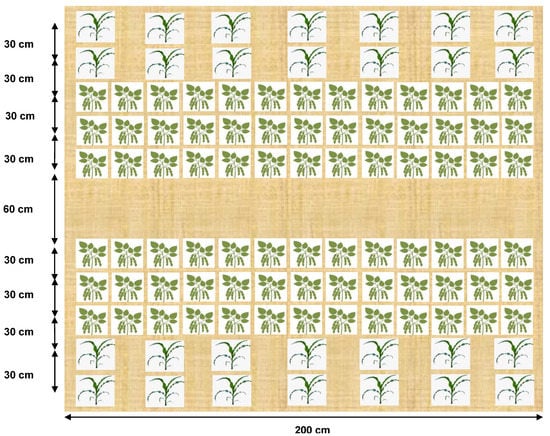 Soil preparation included plowing, disking, levelling and, finally dividing into experimental plots. Each experimental plot consisted of two adjacent wide beds, 60 cm apart. Each wide bed was 200 cm long and 120 cm wide, resulting in a total plot area of 6 m2. On each wide bed, two border rows of maize, and three rows of soybean were sown at 30 cm intra-row spacing (Figure 3). A distance of 60 cm was left between each two experimental plots. Two seeds of the soybean and maize intercrops were sown in hills 15 and 30 cm apart, respectively. This sowing pattern was followed to maintain 75% plant density for soybean, in addition to 50% plant density for maize, in an additive intercropping model. Pure soybean and fodder maize stands were established during both seasons and were sown to 100% plant density for both crops.