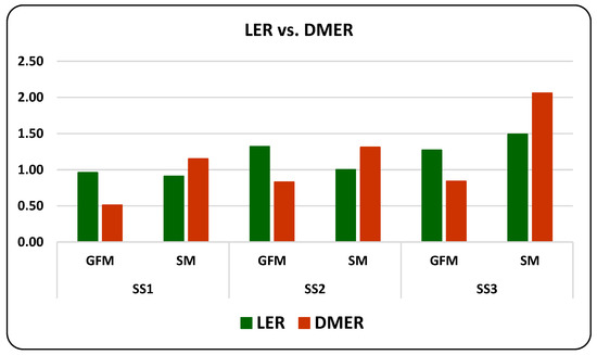 Variations in land equivalent ratio (LER) and dry matter equivalent ratio (DMER) in response to the tested sowing schedules (SS) and maize harvest regimes (GFM and SM).