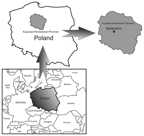 Location of the Bydgoszcz region—within the Kuyavian-Pomeranian Province—in Poland and in Europe.