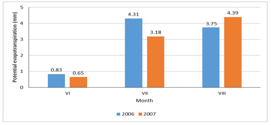 Average air temperature values during the growing season (April–September) in the research years (2006–2007) were higher than in the long-term (1971–2000) by 0.8 °C and 0.5 °C, respectively (Table 3). In the first year of the study, high air temperature values were found in July (22.4 °C), with the value exceeding the long-term mean by as much as 4.2 °C. In the second year of the study, high air temperature values were found in June (18.2 °C, i.e., 1.9 °C above the long-term mean).