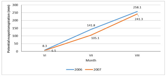 The values of the Standardized Precipitation Index, summarized in Table 6, reflect the actual precipitation conditions occurring in individual decades of the irrigation season. The first decade of July in 2006 was extremely dry, while the second decade of July in 2007 was moderately dry.