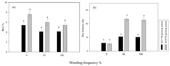 3.2. Brix, Dry and Fresh Biomass Yield Accumulation as Affected by Weeding Frequency