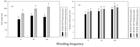 | Weeding frequency | 2 | 38.8 ** | 1554.91 *** | 7168.41 *** | 1788.4 ns | 8569 * | 5.38 *** | 5.15 ** |