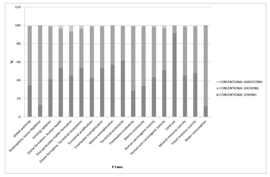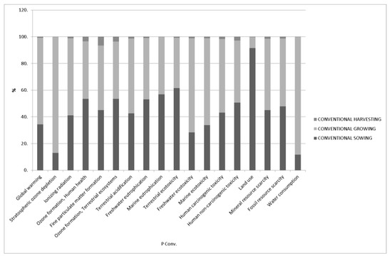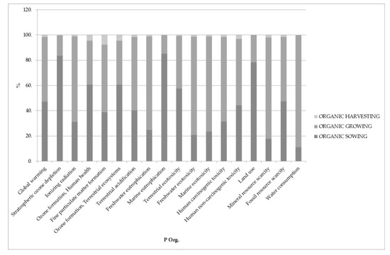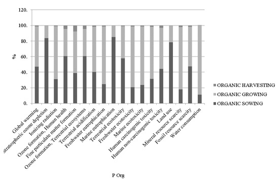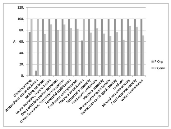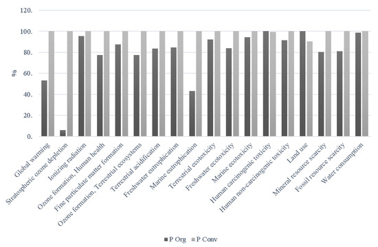 Figure 2 summarizes the two farming systems’ results (Porg and Pconv) as a percentage of the average value of the impact category considered per hectar.