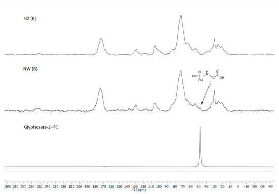 The 13C NMR spectra obtained from untreated NW (S)/R2 (R) biotypes plantago (Plantago lanceolata L.) dried leaf tissue, 48 h after glyphosate application on the treated leaves. Arrow indicates glyphosate signal at approximately 50 ppm identical to the glyphosate-2-13C (99% atom) standard’s chemical shift.