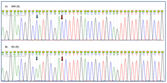 Electropherograms depicting 41 bp of EPSPS for (A) susceptible NW (S) and (B) resistant R2 (R) plantago (Plantago lanceolata L.) biotypes in the sense direction. Cytosine to Adenine transition DNA variant shown by the blue arrow. The red arrow denotes the position of the DNA variant in EPSPS of plantago, which substitutes a dCTP with a dTTP in the resistant phenotype.