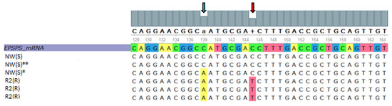 To identify DNA variants in resistant and susceptible plantago biotypes, the partial coding sequence of the EPSPS gene was PCR amplified and sequenced (Figure 6 and Figure 7). A nucleotide variant, resulting in a predicted Proline (Pro) to Serine (Ser) substitution at position 106 of the amino acid sequence of EPSPS [31], was identified in the R biotype (Figure 6). The reference and alternative alleles were included in the multiple sequence alignment against the plantago EPSPS gene reference sequence (Figure 7). A Cytosine to Adenine transition was observed in the resistant biotype (Figure 6) and in the susceptible alternative allele (Figure 7). Cytosine to Thymine transition DNA variant, predicted to result in a substitution of a Proline at position 106 with a Serine, is denoted by the red arrow (Figure 6 and Figure 7).
