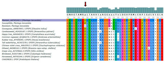 Multiple alignment of eleven Eudicots EPSPS amino acid sequences, the EPSPS Arabidopsis thaliana, and EPSPS Eleusine indica amino acid sequences, as described by [31], against that of plantago (Plantago lanceolata L.) EPSPS resistant and susceptible biotypes. Highlighted amino acids indicate similarities against the plantago reference sequence. The predicted nonsynonymous variant in the resistant plantago biotype is shown with a red arrow and results in the substitution of a Proline to a Serine at position 106 (Pro-106-Ser), as described by [31].