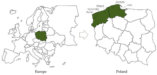 For the need of performing the research, data from Research Center’s for Cultivar Testing (COBORU) [39,40] system field trial books were used, which were created on the basis of the results of official cultivar experiments with very early potato harvested 40 days after full emergence. Predictive linear and non-linear models were built for three potato varieties: Arielle, Riviera, and Viviana. The mentioned varieties occupy leading positions in potato tubers production in Poland. The field experiments were performed in the field units of the COBORU and the Pomeranian Agricultural Advisory Center in Lubań in 2010–2017. The following research uses data from the area of northern and northwestern Poland (Figure 1), i.e., the Experimental Station for Variety Testing in Karzniczka and Szczecin Dąbie, the Experimental Station for Variety Testing in Rarwino and Białogard, and the Pomeranian Agricultural Advisory Center (PODR) in Lubań. The Central Research Center for Cultivar Testing is a unit responsible for conducting and adapting the system of Polish cultivar experimentation to the market economy and European Union standards. The results used in the presented study come from the fields managed as part of the Post-Registration Variety Testing.