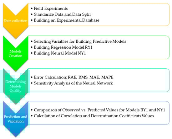 Data for the construction of linear and non-linear models can be divided into several groups. The first one represents agronomic and phytophenological data as well as yielding results. These data were obtained from COBORU’s system field books. The second group contains weather data obtained directly from the electronic database of meteorological phenomena and observations as well as meteorological summary charts registered at each of the research points. In the absence of measurement data from the meteorological stations of the above-mentioned units, for example the insolation sum, observation, and measurement data from the archival resources of the Institute of Meteorology and Water Management—National Research Institute—synoptic and climatic stations located as close as possible to the experimental points were used. If, for some reasons, data on soil abundance in basic nutrients were missing, the results of current reports on soil tests carried out by Regional Chemical-Agricultural Stations were used during the preparation of the data for the models. Figure 2 show the general framework of the paper.