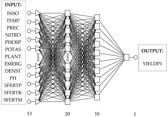 An important aspect in dealing with artificial neural networks is the selection of the right learning method and network topology. The testing stage of network topology showed that the MLP network is the best network for potato tuber yield forecasting, which very well solves prediction problems in agriculture [50,51]. In the presented work, single-direction learning of two-layer MLP neural networks were based on a two-stage process. In the first step, the generated networks were trained using the backward propagation of errors method. The second stage involved learning with the use of the conjugate gradients method. As far as choosing the right network topology for a specific task is not a big issue, it is quite a problematic to determine the optimal number of neurons creating progressive hidden layers. The selection of the number of neurons in successive layers is a key issue that is decisive for the generalizing properties of the network. Determining their optimal number depends mainly on the experience of the network creator. A relatively large number of neurons improves the computing power of the network; however, exceeding a certain number may result in overfitting the neuron network, which is selected on the basis of a detailed analysis of the value of the quality parameters of the neural network having 20 neurons in the first hidden layer and 10 neurons in the second hidden layer. The obtained results allow us to assume that the model’s goodness-of-fit in respect to the data does not always involve the use of many neurons in hidden layers. Applying the right number of neurons is a complicated process, requiring a lot of testing, compromises, and excellent data preparation. Although the complexity of the model depends on the nature of the modeled issue, those neural networks with a relatively simple structure are more desirable and accepted also by other researchers [52,53].