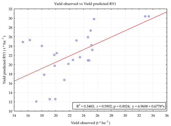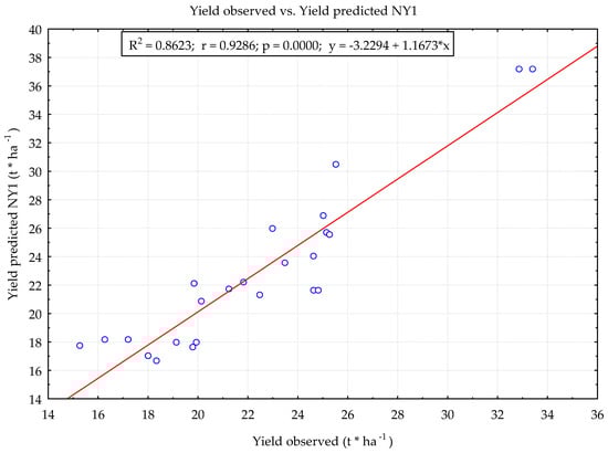 The results of the above studies show that the goodness-of-fit between the actual values and those predicted by the RY1 and NY1 models was statistically significant (α = 0.05). Such a comparison covered 24 cases constituting the Bp verification subset. The relations between the discussed values were described by equations (Figure 4 and Figure 5) and the determination coefficients R2. The NY1 neural model was characterized by a better fit of the generated forecasts in relation to the actual yield (R2 = 0.8623) comparing to the regression model RY1 (R2 = 0.3483). This is another argument in favor of neural modeling over regression methods in yield prediction.