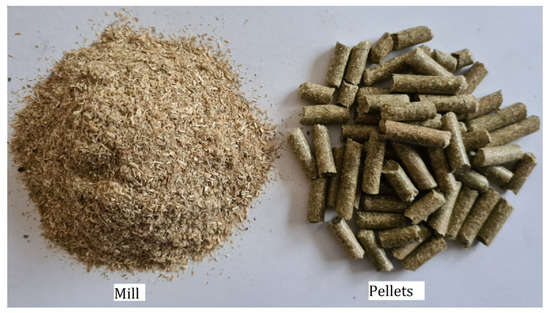 The chopped and milled reed canary grass biomass was granulated with a 7.5 kW pelletizer (Polexim, Izdebki, Poland) with a horizontal pellet production matrix with 6 mm holes. The productivity of pellet production was 250–300 kg h−1.The photo of milled and granulated reed canary grass is presented in Figure 2. Pine wood sawdust pellets were also produced and tested as a control.