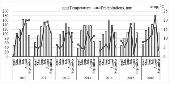 Meteorological parameters for the 2010–2016 vegetation period (from April to September) are presented in Figure 3. In 2010 and 2011, the weather (temperature and precipitation regime) was warm and rainy and, thus, the growing conditions for reed canary grass biomass were quite favorable with relatively good distribution of precipitation. In 2012 and 2013, during the period of intense grass growth, there was a periodical shortage of soil moisture in the upper soil layer.