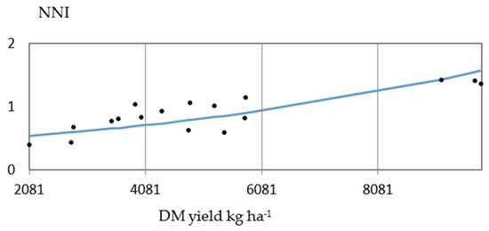 The dependence of DM yield of reed canary grass and nitrogen nutrition index (NNI) might be expressed by the following exponential equations: y = 1563.53 × e1.22044x (mutual correlation—+0.86); (for 1st cut) and y = 0.59 × e0.0002x (for 2nd cut) (+0.85). These dependences are presented in Figure 4 and Figure 5.