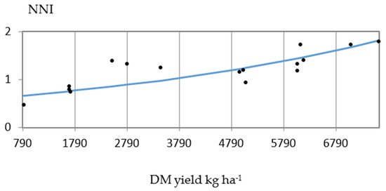 The nitrogen nutrition index (NNI), which indicates the sufficiency of nitrogen in plants, was calculated according to the following equation: NNI = Nact/Nc, where Nact is the actual N content as a percent of the dry matter of reed canary grass biomass; Nc is the critical content of N (Nc) calculated according to the following equation: Nc = (5.35 × DM (t ha−1)−0.442 [30].