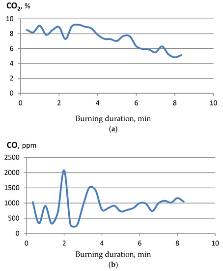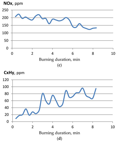 The determined emissions of harmful pollutants obtained by burning granules are presented in Table 5, and the dynamics of the emission of harmful gases from burning reed canary grass is presented in Figure 6. The research results show that the combustion process is slowed down when the loaded portion of plant pellets is finishing to burn or when the burning intensity decreases. Emissions of all harmful combustion gases also tend to decrease.