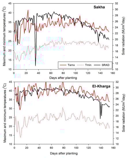 The obtained 30 test-crosses and newly developed high-yielding commercial check hybrid TWC-368 were evaluated at two different locations (Sakha and El-Kharga) during the growing season of 2019. The first location was Sakha Agricultural Research Station, Agricultural Research Center (ARC), Egypt (30°3′ N, 31°3′ E) and the second one was the Experimental Farm, Faculty of Agriculture, New Valley University, El-Kharga, Egypt (30°19′ N, 25°15′ E). The two locations; Sakha and El-Kharga represented distinct soil types. The soil in Sakha represents the old Nile valley soils and is classified as clay soil (24.32% sand, 23.99% silt, and 51.69%clay) while the soil in El-Kharga represents the newly reclaimed soils and classified as sandy soil (86.50% sand, 8.58% silt, and 4.92% clay). The physical and chemical soil properties are presented in Supplementary Materials Table S2. Additionally, the meteorological data in each location are presented in Figure 1. Randomized Complete Block Design (RCBD) with three replications was applied in each location. Each plot consisted of 2-ridges of 5-m long and 0.7-m width. With two kernels/hill on one side of the ridge, the hills were spaced at 0.25-m, later thinned to one plant/hill. Standard agronomic practices including insect pest and weed control were applied as recommended for growing maize in the region.