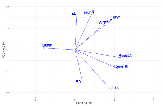 Investigating the interrelationships among plant traits can provide valuable information. The biplot of principal components is a statistical procedure for assessing the interrelationships among evaluated traits. In the present study, a strong positive association was reflected between resistance to LWD under low and high N levels. Moreover, a positive association was detected between resistance to LWD and grain yield per plant. Various researchers have applied PC-biplot to understand the interrelationships among studied traits as Desoky et al. [51], Mansour et al. [52], Moustafa et al. [53], and El-Sanatawy et al. [54].