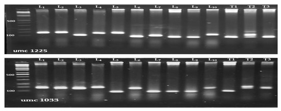 PCR amplified fragments for highly polymorphic SSR markers; umc1033 and umc1225. M is a 100 bp DNA ladder.