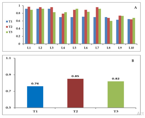 Pairwise genetic distances (GD) between the inbred lines and testers based on SSR markers varied from 0.60 (between L8 and T3) to 0.97 (between L1 and T2), with an average of 0.81 (Figure 4A). The GD means of the 10 inbreds with T1, T2, and T3 testers were 0.76, 0.85, and 0.82, respectively (Figure 4B). The neighbor-joining tree on the basis of genetic distance matrix divided the 13 genotypes (10 inbred lines and three testers) into three major clusters with internal sub-clusters showing varying degrees of diversity (Figure 5). Cluster I consisted of the inbreds L1, L2, and L3. Meanwhile, cluster II included the inbreds L5, L6, L7, and L4. Moreover, cluster III contained the inbreds L8, L9, and L10, as well as the three testers T1, T2, and T3. This cluster comprised of two sub-clusters; the first cluster involved four genotypes, L8, L9, L10, and T1, while the second sub-cluster consisted of T2 and T3 testers.