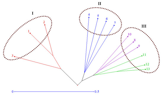 Neighbor-joining tree of the 13 genotypes (10 lines and 3 testers) based on SSR analysis. The inbred lines are 1–10 and testers are 11–13, in the same order as Table 3.