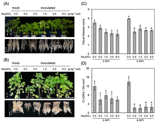 Compared to the un-inoculated control (mock), a remarkable reduction in plant growth was observed upon infection in the inoculated control plants (0 Si). In contrast, Si application alleviated the negative effects of C. ilicicola infection on the growth of soybean plants at both sampling time points (Figure 1A,B). Compared to the inoculated control, Si application decreased RCR severity in the roots by 17%, 38%, 36%, and 36% at 3 WPI and by 37%, 29%, 33%, and 34% at 6 WPI, for 0.5, 1.0, 3.0, and 6.0 g Na2SiO3 kg−1 of soil, respectively (Figure 1C). The rates of decrease of RCR severity were similar for all Si treatments, and no significant difference was observed at either sampling time point.