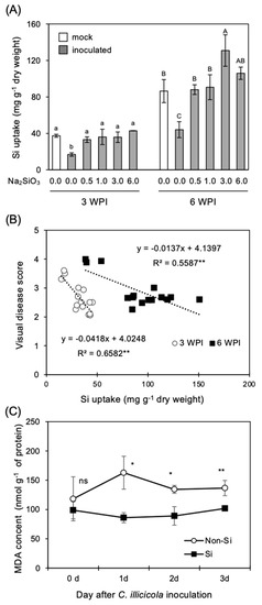 Correlation analysis of (A) shoot Si content and soil Si concentration, (B) disease severity at 3 and 6 WPI and Si uptake, and (C) MDA content in the roots and Si treatment (n = 12). Different letters (lowercase for 3 WPI, uppercase for 6 WPI) indicate significant differences among treatments (p < 0.05), as per Tukey’s HSD test. Asterisks indicate significant difference between control (untreated) and Si-treated seedlings (t test, * and ** indicate p < 0.05 and 0.01, respectively).