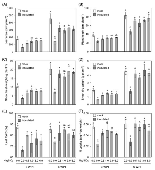 Similarly, RCR significantly (p < 0.05) reduced N uptake in the shoots of soybean plants by 56% and 54% at 3 and 6 WPI, respectively (Figure 3F); however, N uptake was greatly restored by most Si concentrations tested.