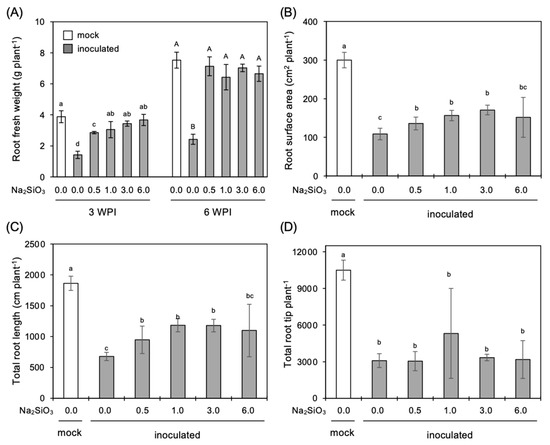 Root growth parameters were also significantly (p < 0.05) reduced in response to RCR; FWs decreased by 63% and 68%, surface area decreased by 25% and 64%, total length decreased by 43% and 64%, and total tip number decreased by 31% and 71% at 3 and 6 WPI, respectively (Figure 4). However, again, root growth parameters, except for total tip number, were effectively restored by Si treatment (Figure 4).