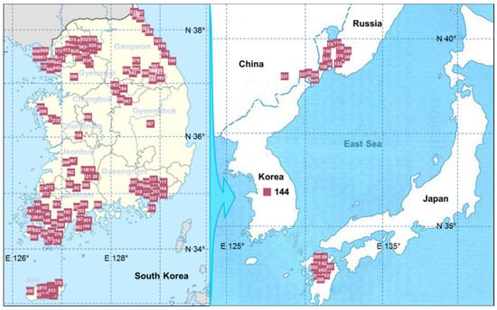 Collection sites of Miscanthus sinensis accessions in Korea, China–Russia, and Japan.