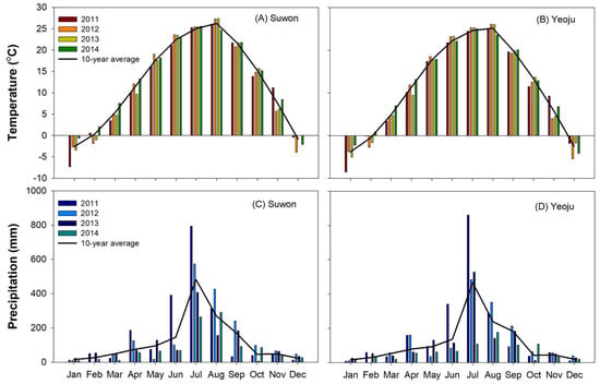 Monthly average air temperature (A,B) and precipitation (C,D) in Suwon and Yeoju during the cultivation period from 2011 to 2014 with the 10-year monthly average data (2005–2014).
