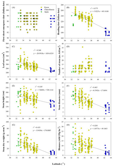 Relationships between the latitude of miscanthus collection site and phenological and agronomic traits assessed in the fourth year after miscanthus planting (first shoot emergence date, A; heading date, B; leaf area, C; number of stem, D; stem height, E; stem diameter, F; stem dry weight, G; biomass yield, H).