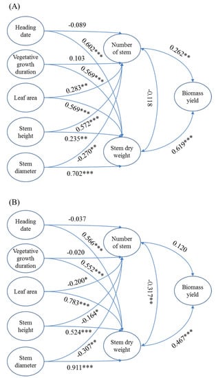 Schematic representation of the correlation between phenological trait (heading date), main agronomic traits, and biomass yield assessed in the 2nd (A) and 4th (B) year after miscanthus planting. *, **, and *** indicate statistical significance at 0.05, 0.01, and 0.001 levels, respectively.