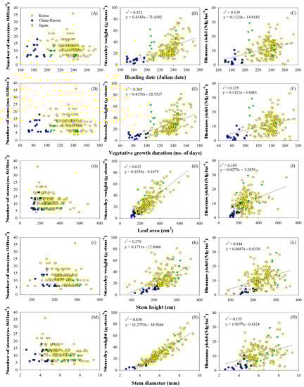 Linear regression analyses revealed that stem diameter is the most significant contributor to stem dry weight (r2 = 0.830), followed by leaf area (r2 = 0.613), heading (r2 = 0.321), vegetative growth duration (r2 = 0.305), and stem height (r2 = 0.279) (Figure 6). Our findings that leaf area and stem dry weight were most strongly related to biomass suggest that leaf area plays an important role in stem growth, particularly stem diameter, and biomass accumulation. Previous studies reported that vegetative growth durations, stem height, stem diameter, and stem dry weight were strongly correlated with biomass yield potential [8,11,16,17,18,19,20,21,22,23,30,34,38]. However, the linear relationships between biomass yield and phenotypic traits were not strongly supported by the regression coefficients (Figure 6C,F,I,L,O). It can be assumed that biomass yield is affected by complex interactions of environmental factors and various phenotypic traits. Clifton-Brown et al. [7] and Robson et al. [21] reported that miscanthus biomass yield is a combined result of complex associations with environmental factors and phenotypic traits. Although our results suggested that miscanthus biomass is more attributed to leaf area, stem diameter, and stem weight than the other traits, these findings do not mean that the other traits should not be taken into account. Our results imply that the miscanthus accessions tested in this study are genetically very diverse.
