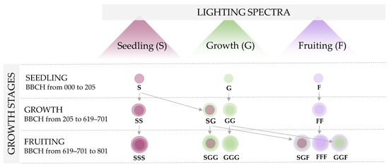 For each tomato growth stage (Figure 1), plants were shifted between lighting treatments. In the initial growth stage (BBCH 000-205), the impact of “seedling” (S), “growth” (G) and “fruiting” (F) spectra on tomato growth and photosynthesis parameters were compared. In the stage of tomato growth and biomass accumulation, until the emergence of initial inflorescences (from 3rd to 8th week after germination; BBCH from 205 to 619–701), plants were further cultivated under the same spectrum (SS, GG, FF), but part of the plants were moved from the “seedling” to “growth” spectrum (SG). From BBCH 619–701 to 801 (ripening of first fruits; 8th to 12th week after germination), plants were cultivated under the same spectrum (SSS, GGG, FFF and SGG) and part of the plants from the “growth” spectrum were shifted to the “fruiting” spectrum (SGF, GGF), seeking to create growth-stage specific alteration of lighting spectrum and compare to the response of tomato plants cultivated under constant lighting spectrum.